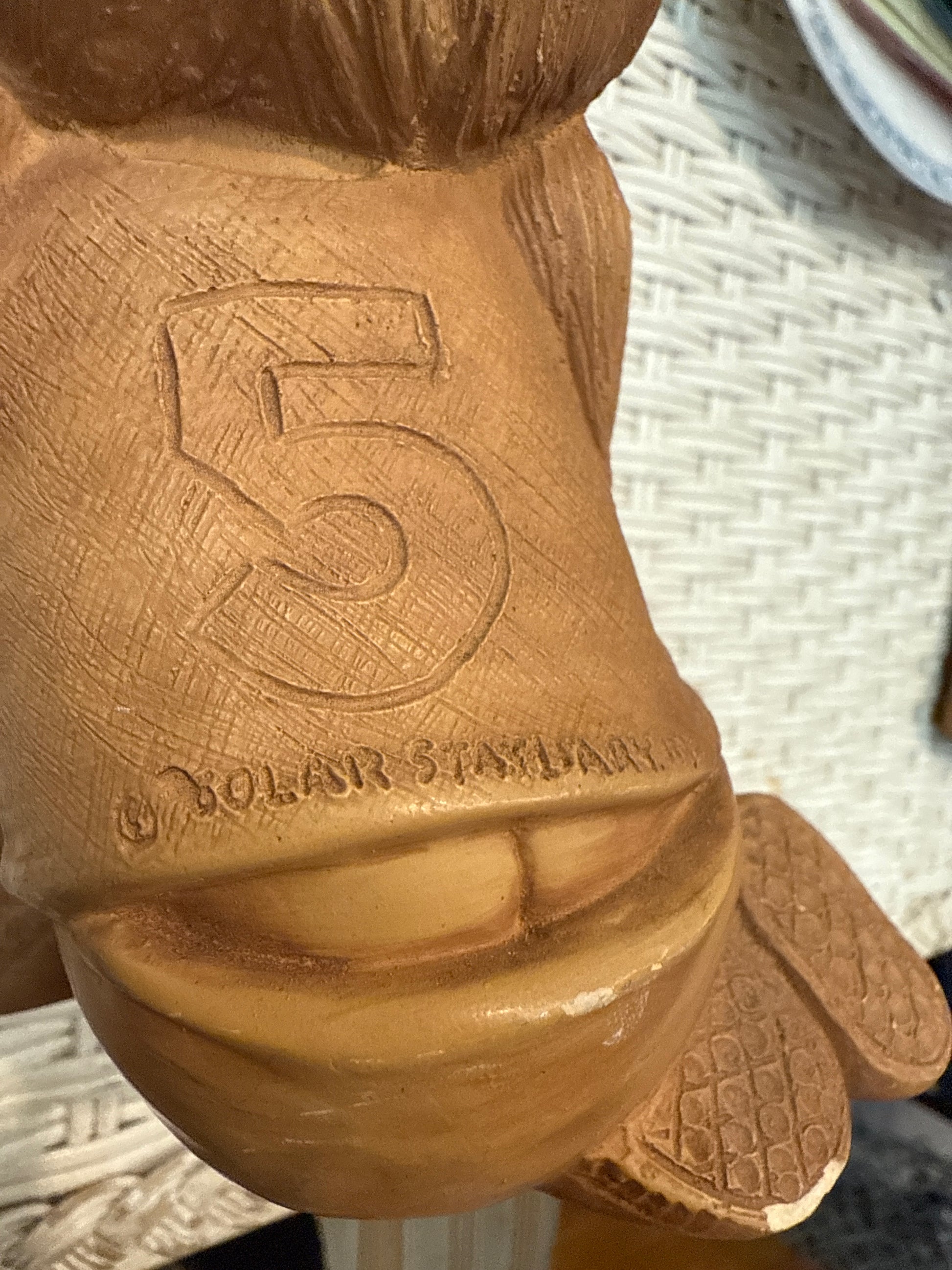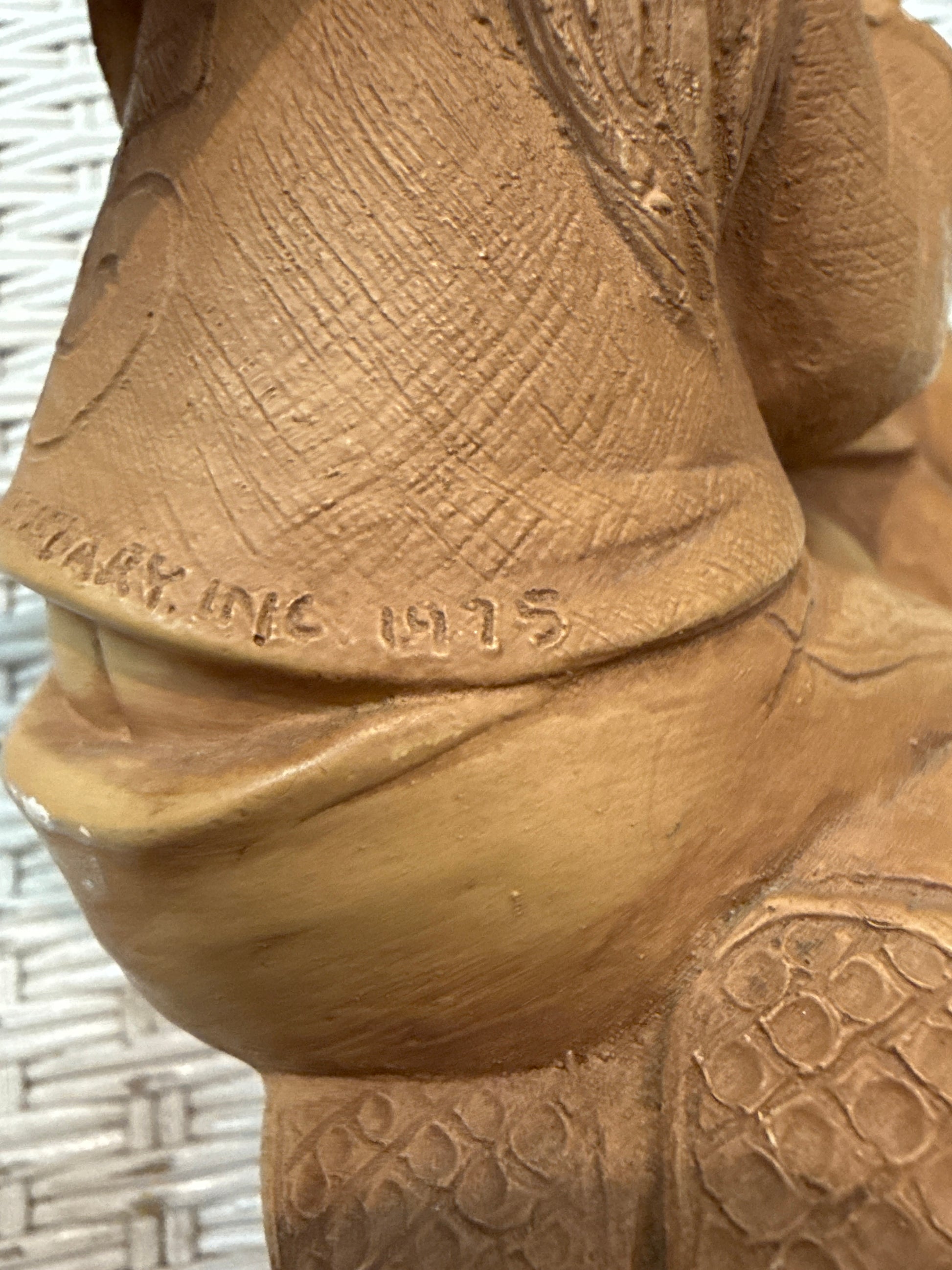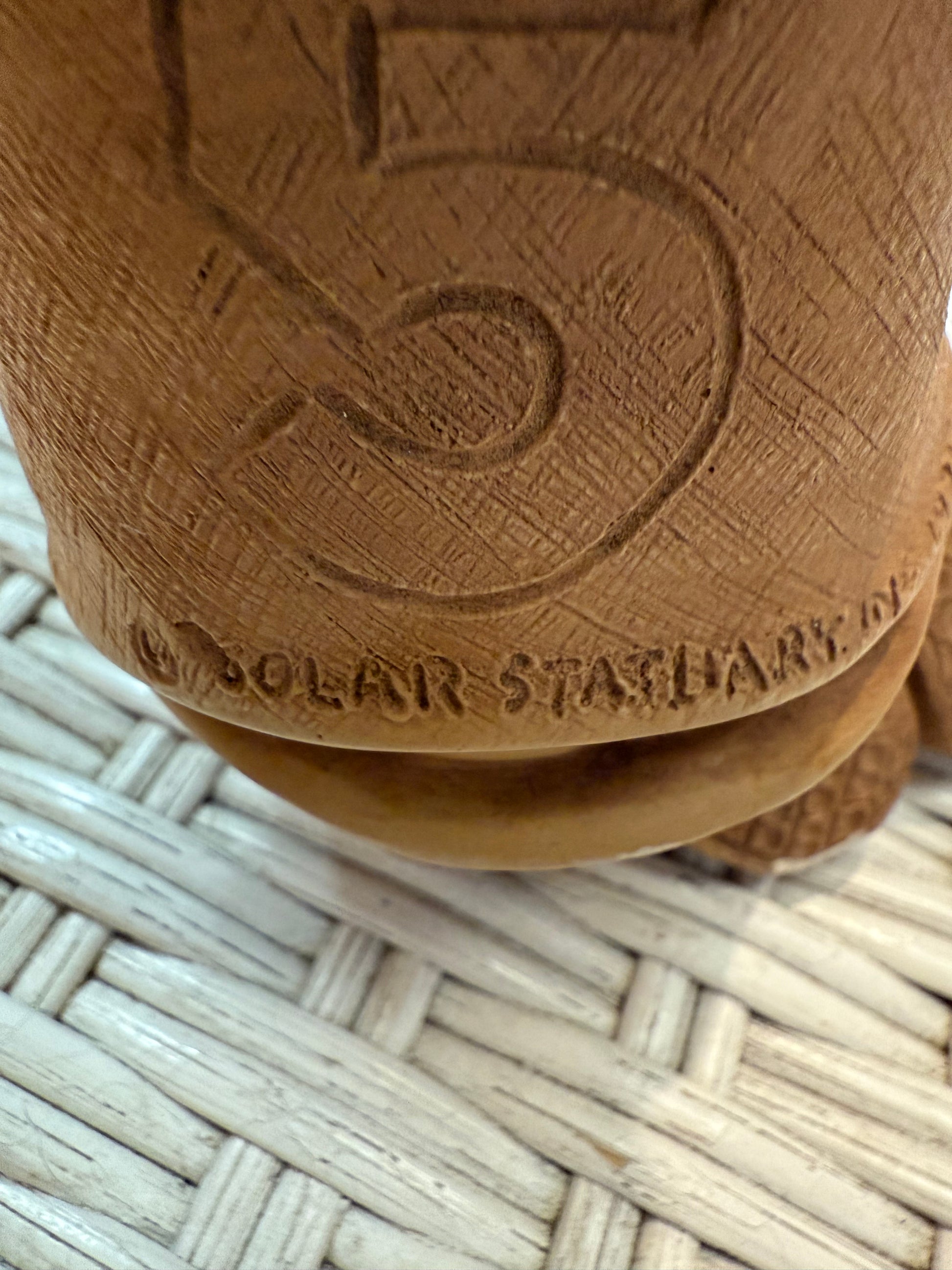 Marked with Solar Statuary, Inc. and dated 1975, this 6-inch sculpture is made of resin crafted to resemble aged earthenware. The carved textures mimic well-loved clothing, and a bold number “5” is etched into the back like a badge or… perhaps a countdown.