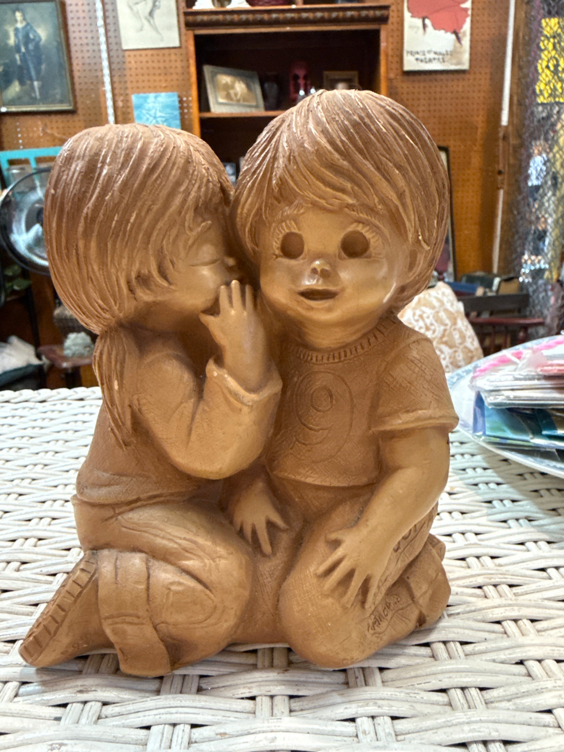 From the attic of forgotten memories comes this unsettlingly sweet relic — a 1975 terracotta-hued figurine by Solar Statuary, titled “Got A Secret.” Two children kneel in silence, one caught mid-whisper, the other smiling just a little too wide. Their hollow eyes seem frozen in time, as if they’ve held onto that secret for far too long. What was said? And more importantly… who heard?