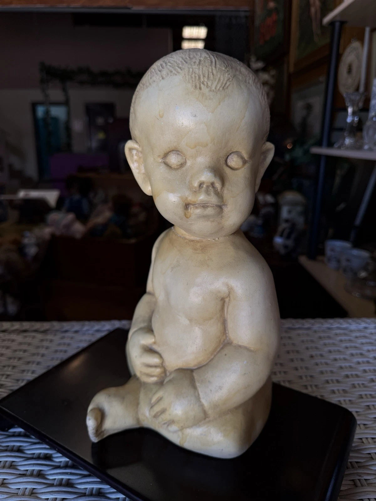 They say silence speaks volumes, and this baby has said nothing for decades. Once a coin bank, this hollow-eyed figure sat on the windowsill of an old farmhouse in Florida, where strange events were whispered about but never confirmed. Coins would rattle at night, even when the bank was empty. Visitors often reported a chill in the room where it was kept, and animals refused to go near it. Whether cursed, blessed, or simply misunderstood, this baby’s gaze is unshakable. And it’s looking for a new home.