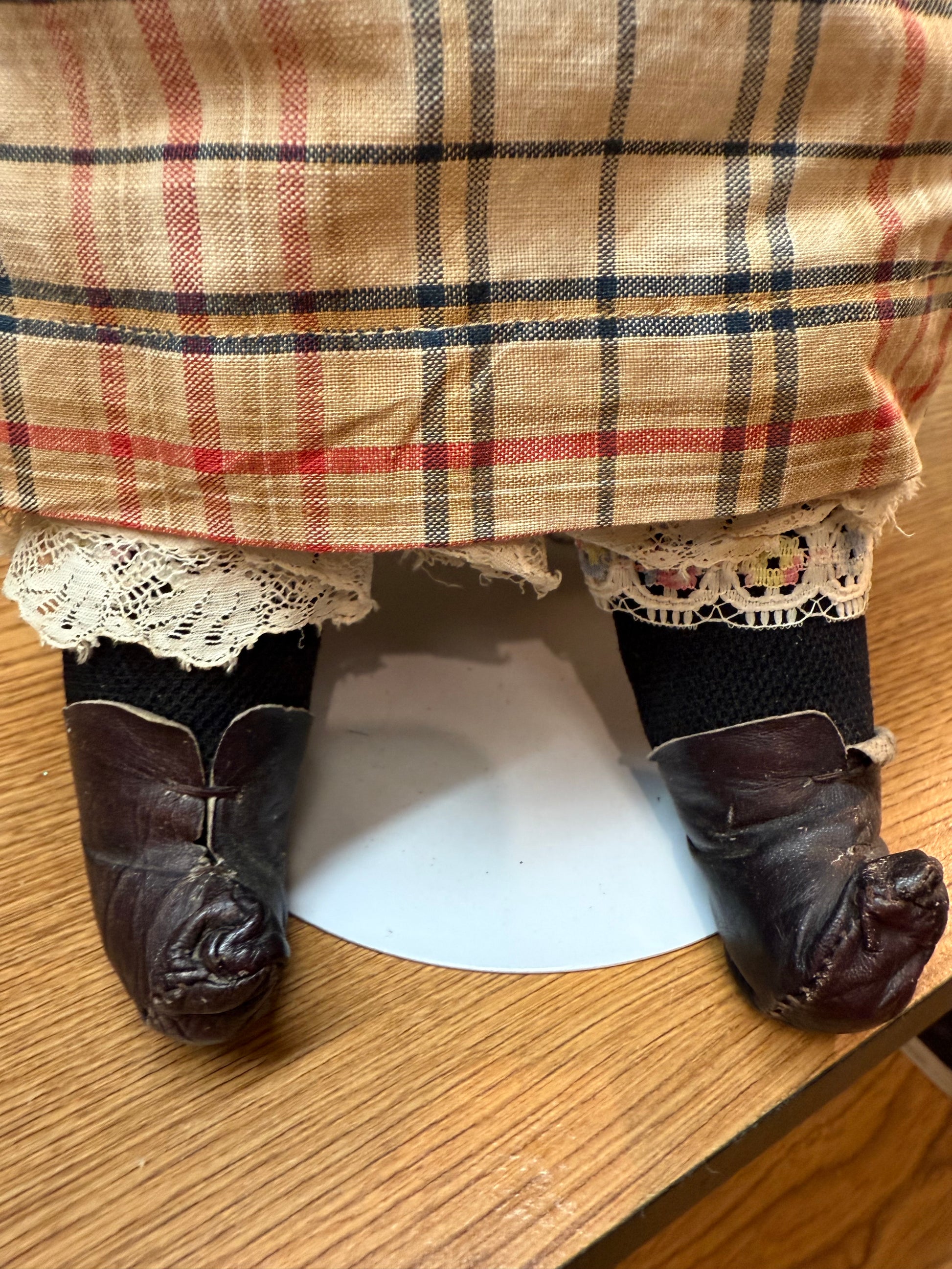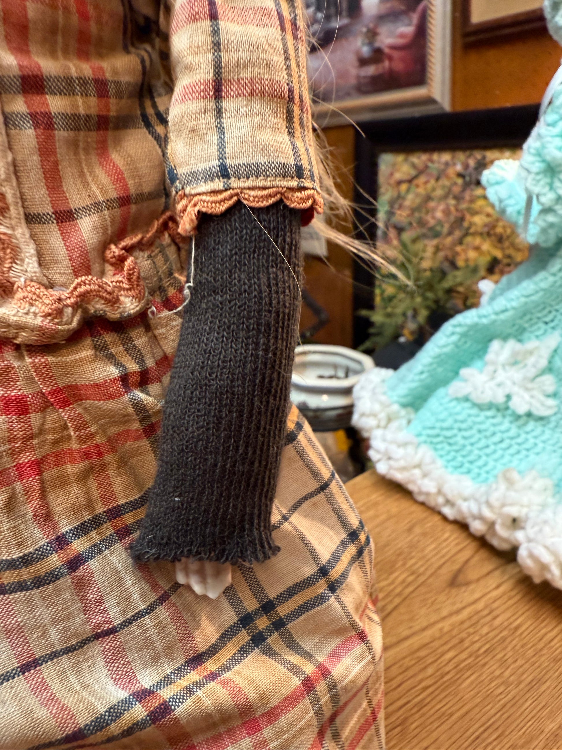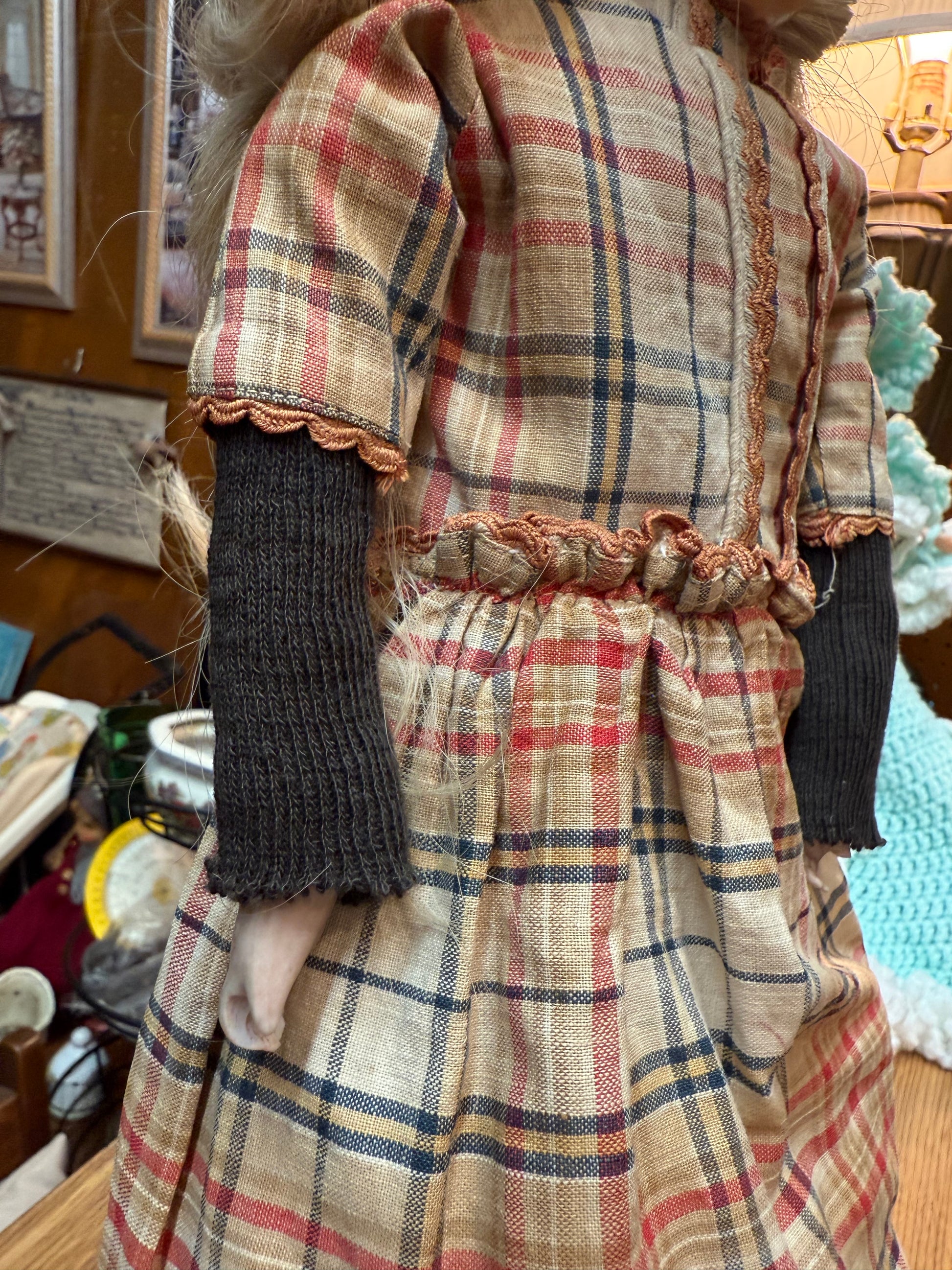 • Original vintage clothing: cotton plaid dress, black knit undersleeves, lace-trimmed pantaloons