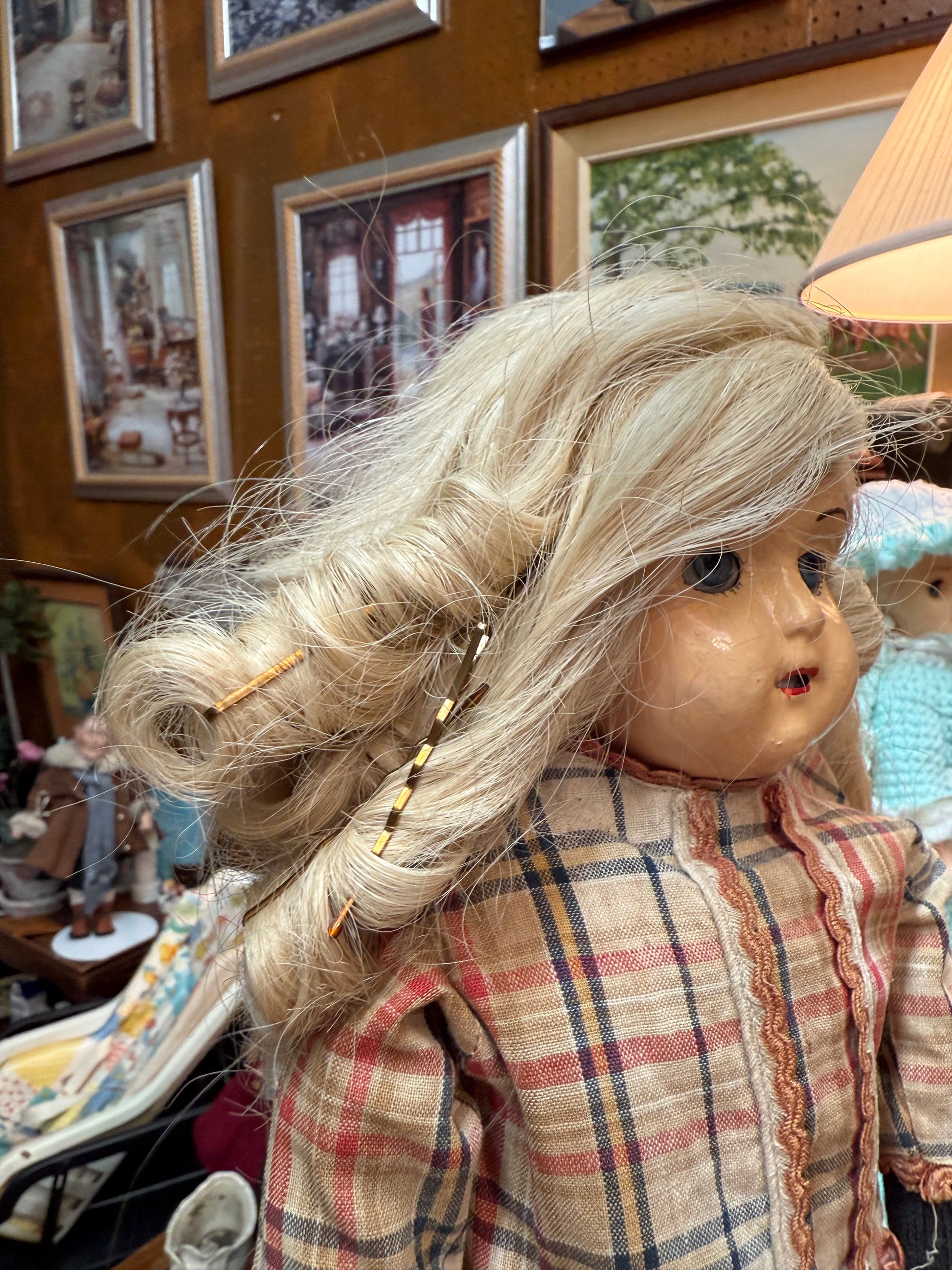 This rare find is a metal head doll, likely made between 1910 and 1930, with a hand-painted face over a pressed tin or iron base. Dolls of this kind were manufactured in smaller numbers, often for export, and are rarely seen in such preserved condition. Elsbeth’s vacant stare and slightly parted lips suggest she’s not entirely asleep… just watching.