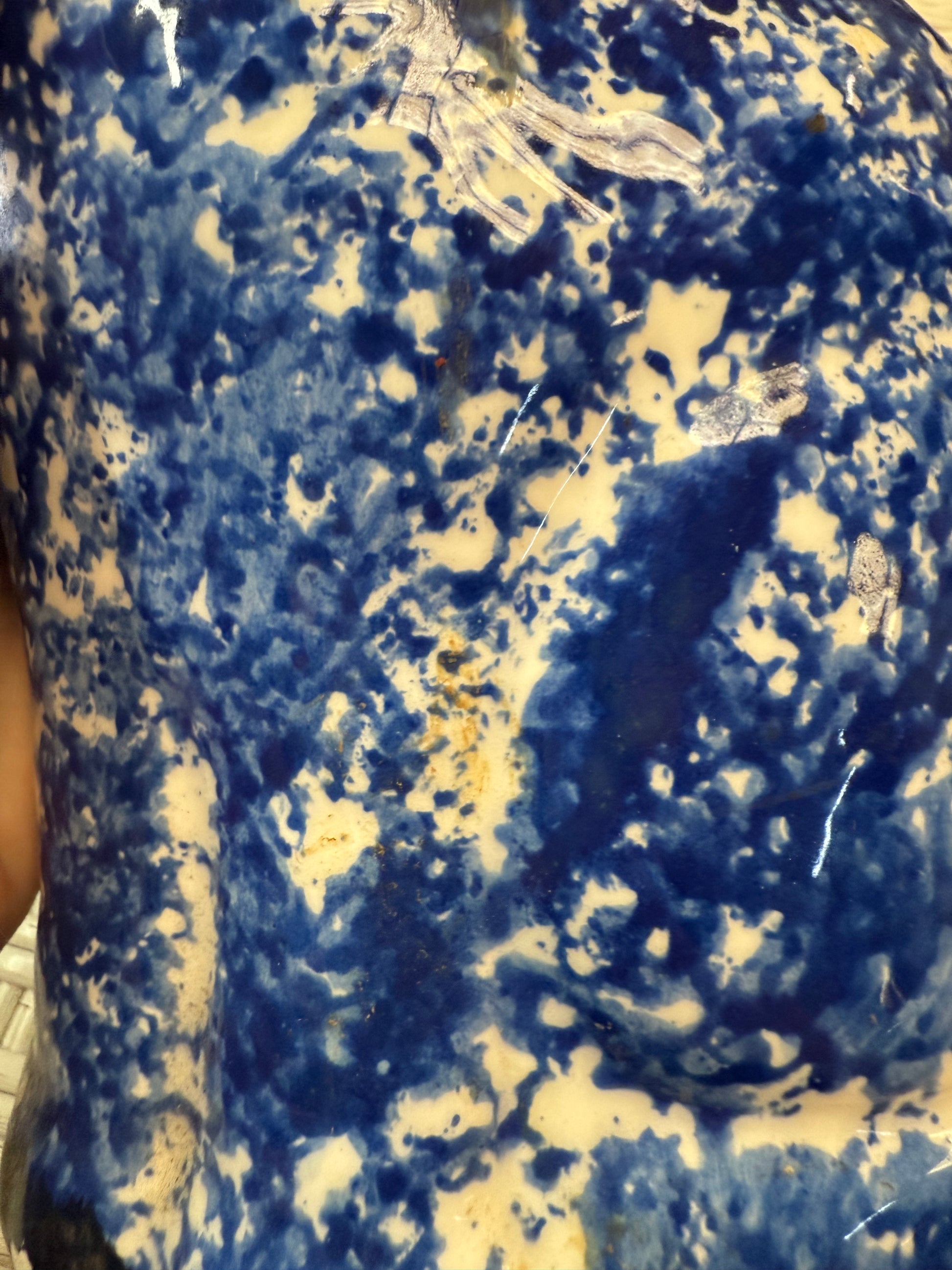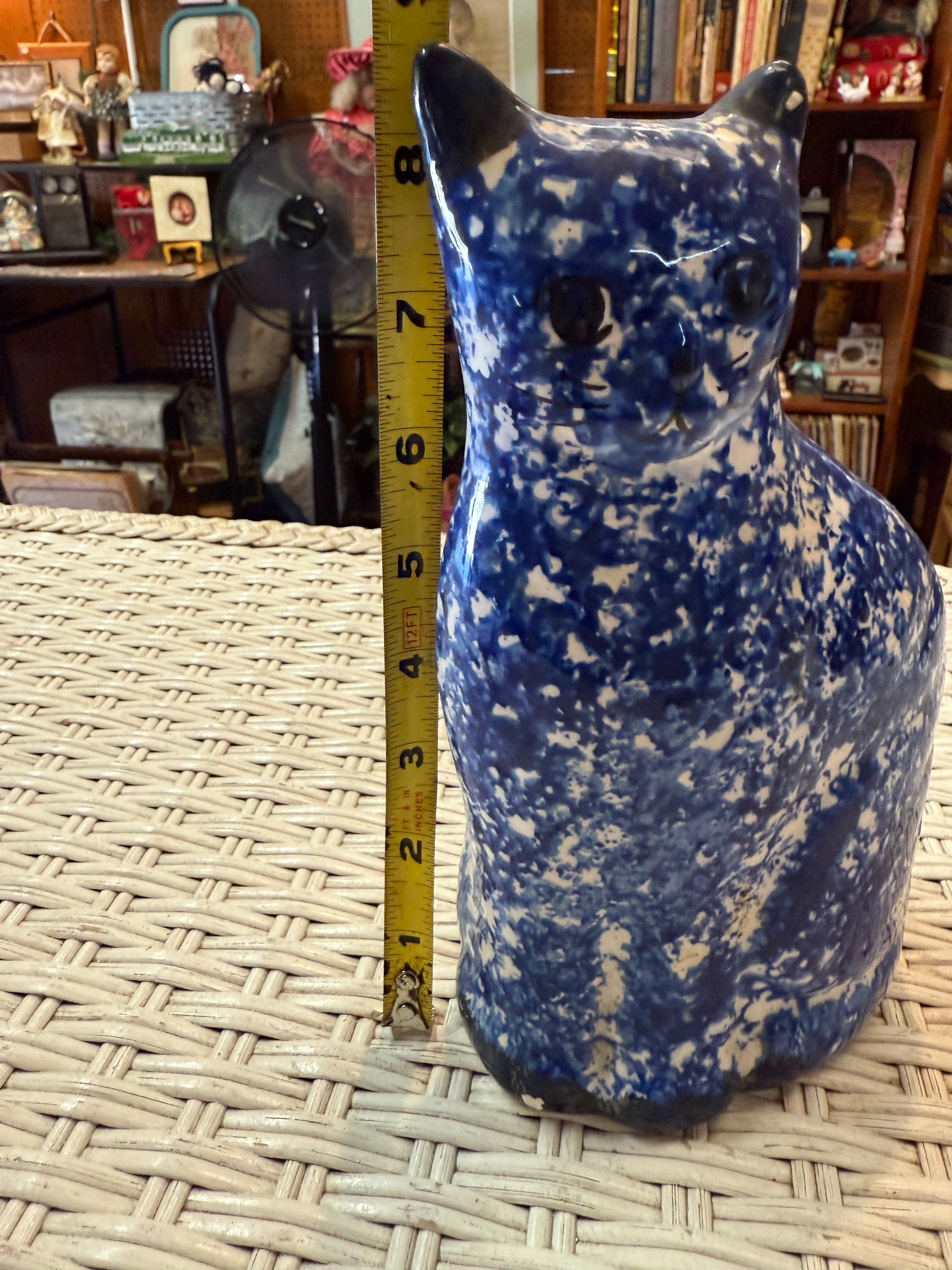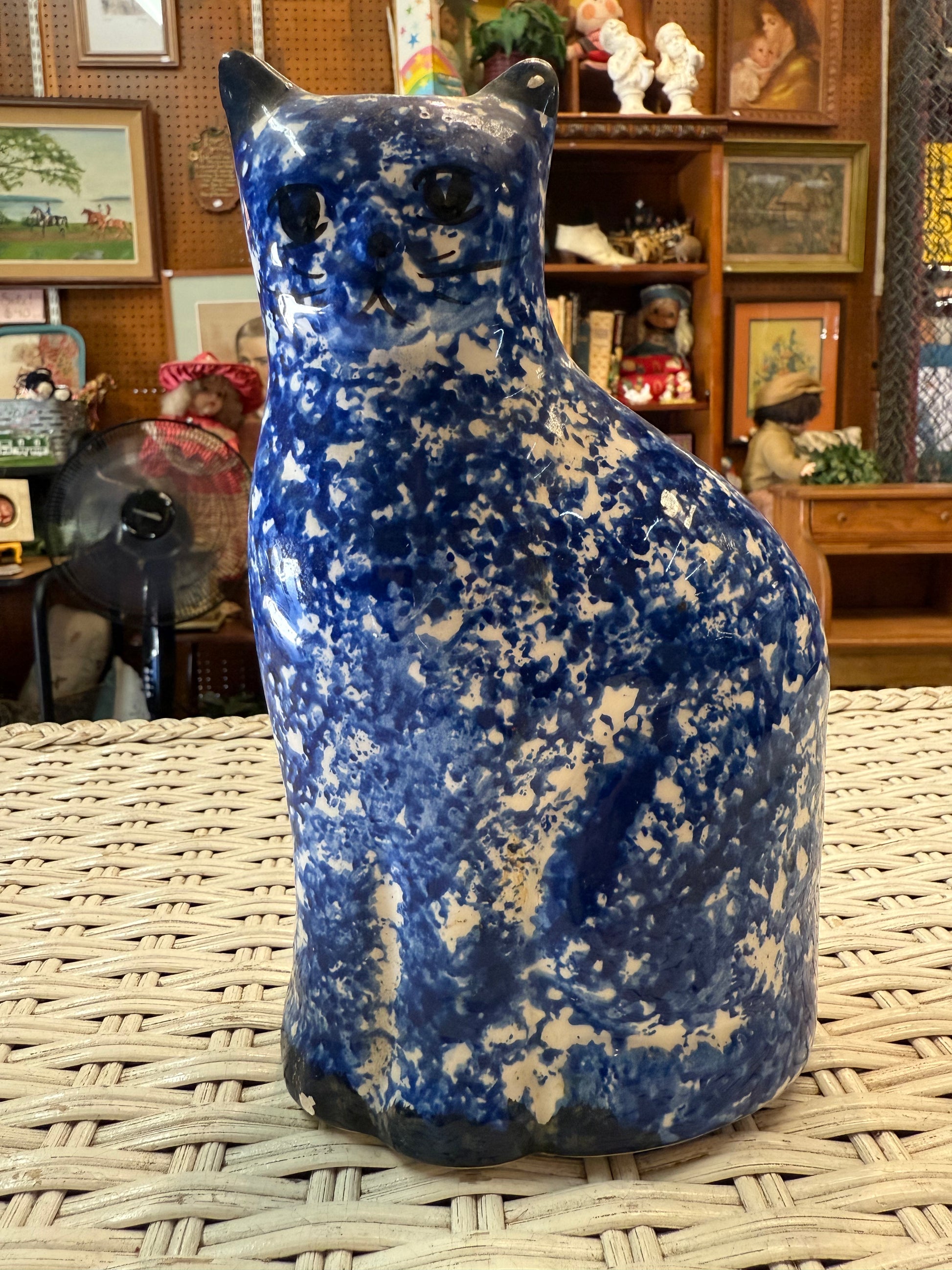 Splatter Cat Bank – Vintage Spongeware Blue Ceramic – Hand Painted Face