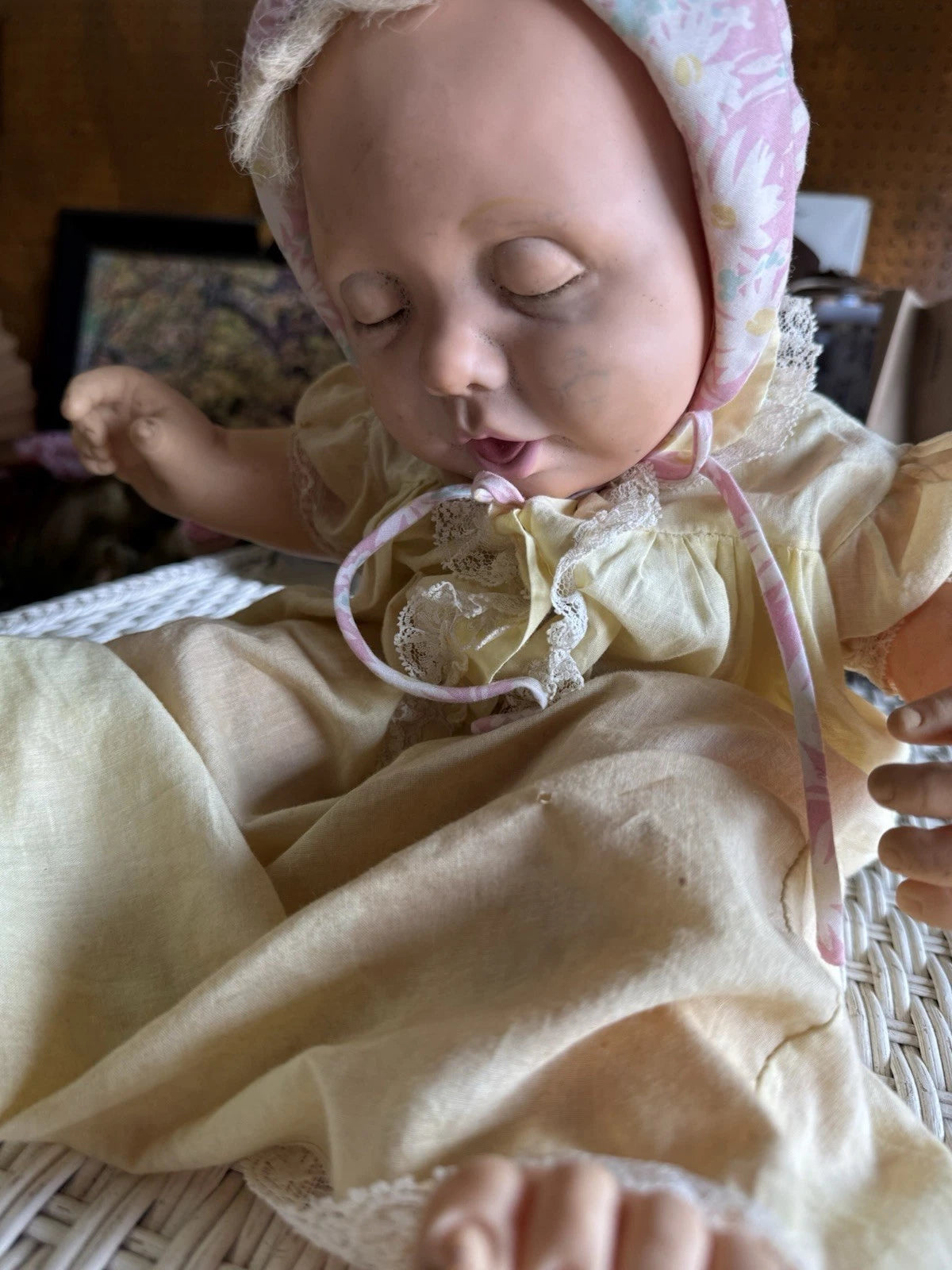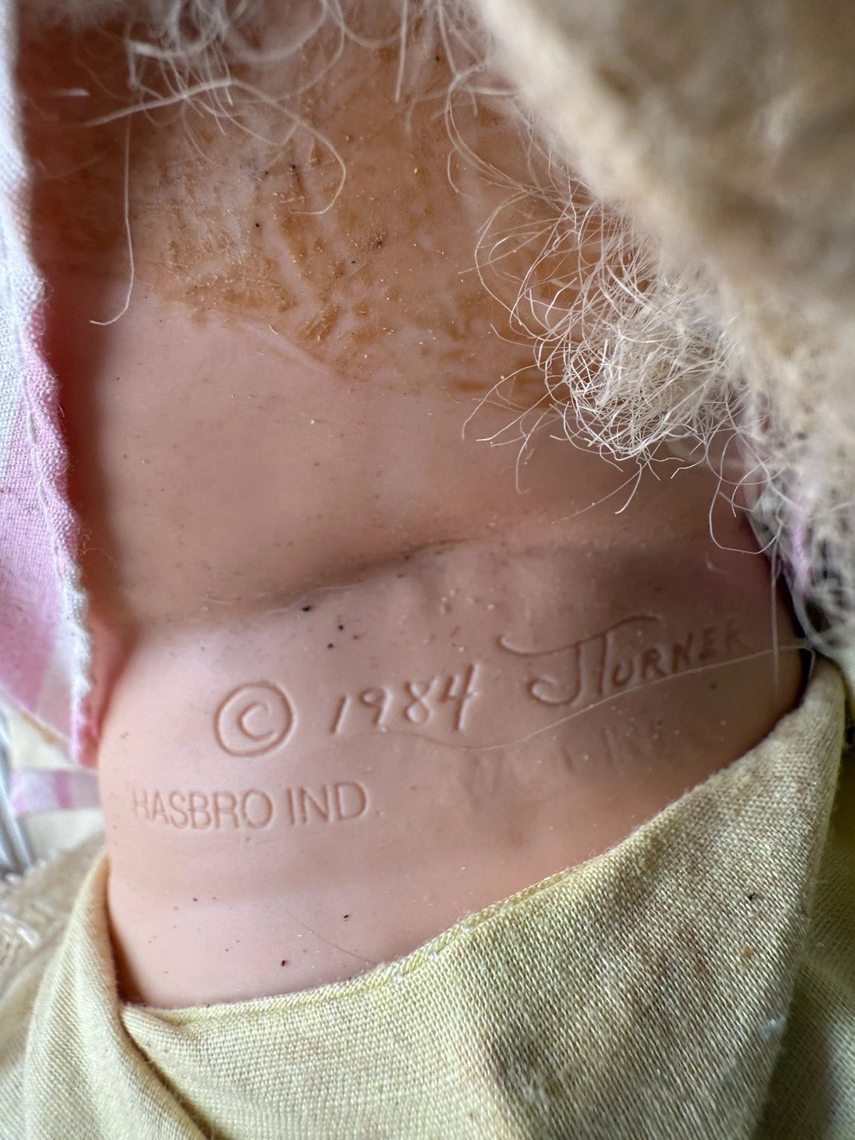 This vintage 1984 baby doll by Hasbro, designed by J. Turner, has never opened her eyes—not once. Her lids are sealed in slumber, and her parted lips whisper things only the walls can hear. Wrapped in a faded yellow gown and tied into a bonnet trimmed with daisies, she seems peaceful… too peaceful.