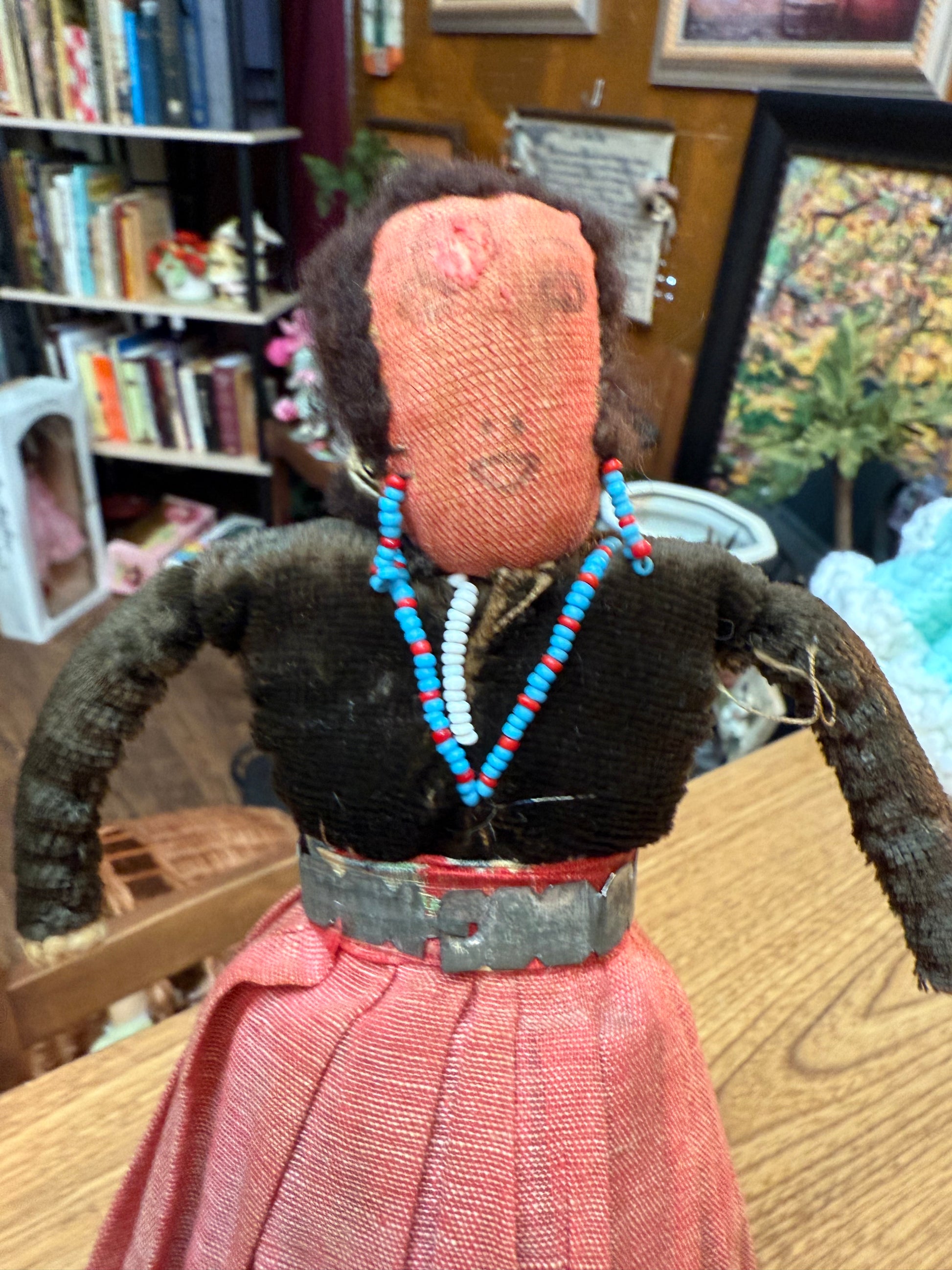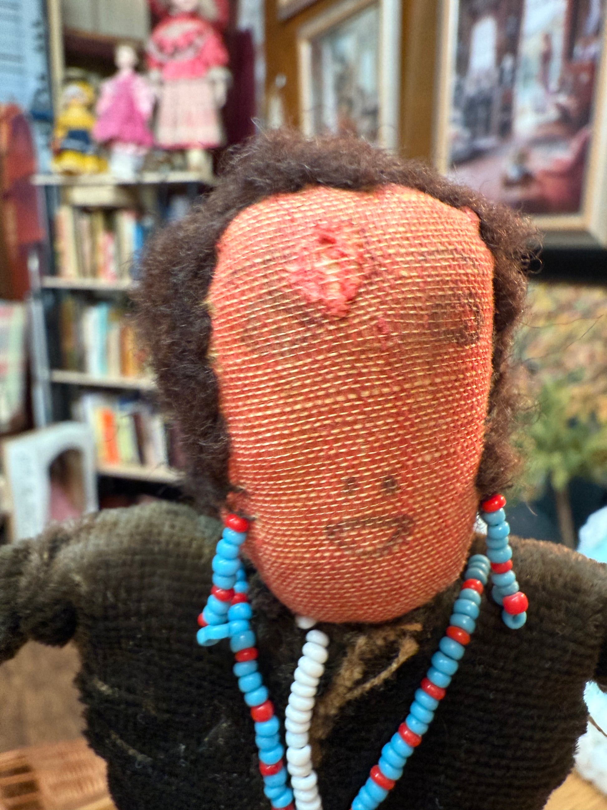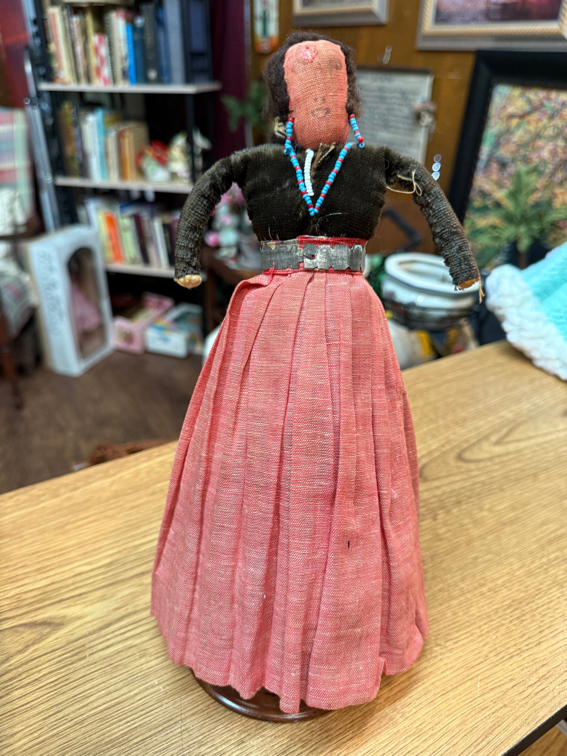 Standing just over 11 inches tall, this early handmade cloth doll feels more like a figure of remembrance than a toy. Her features are hand-stitched, though time—or something else—has worn them nearly away. What remains is a vague expression and a piercing silence that seems to follow you across the room.