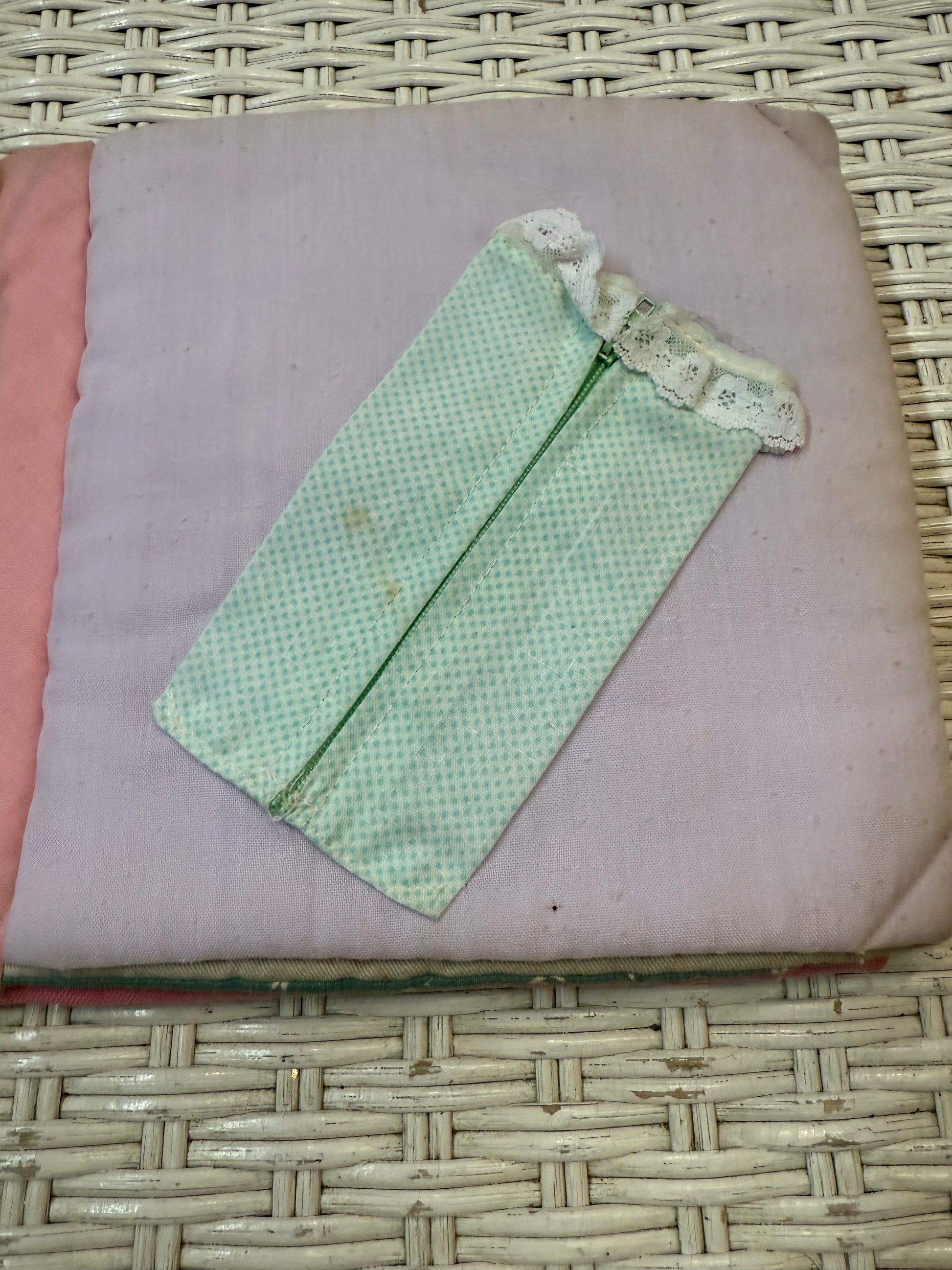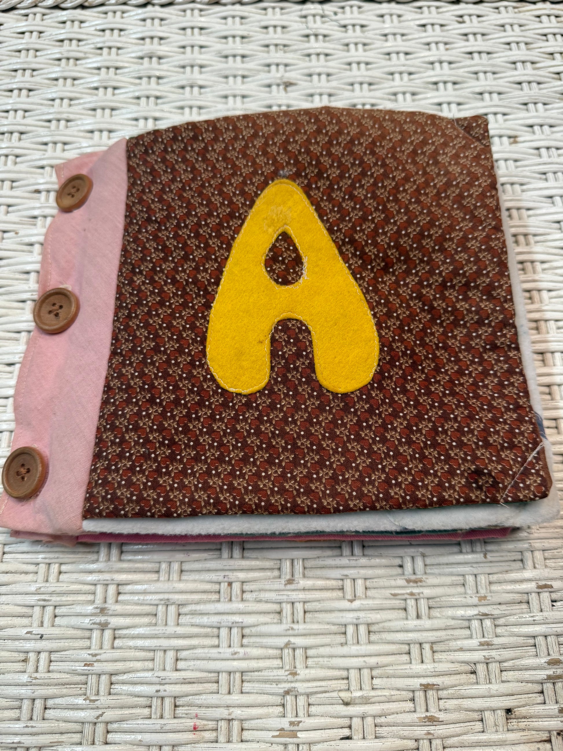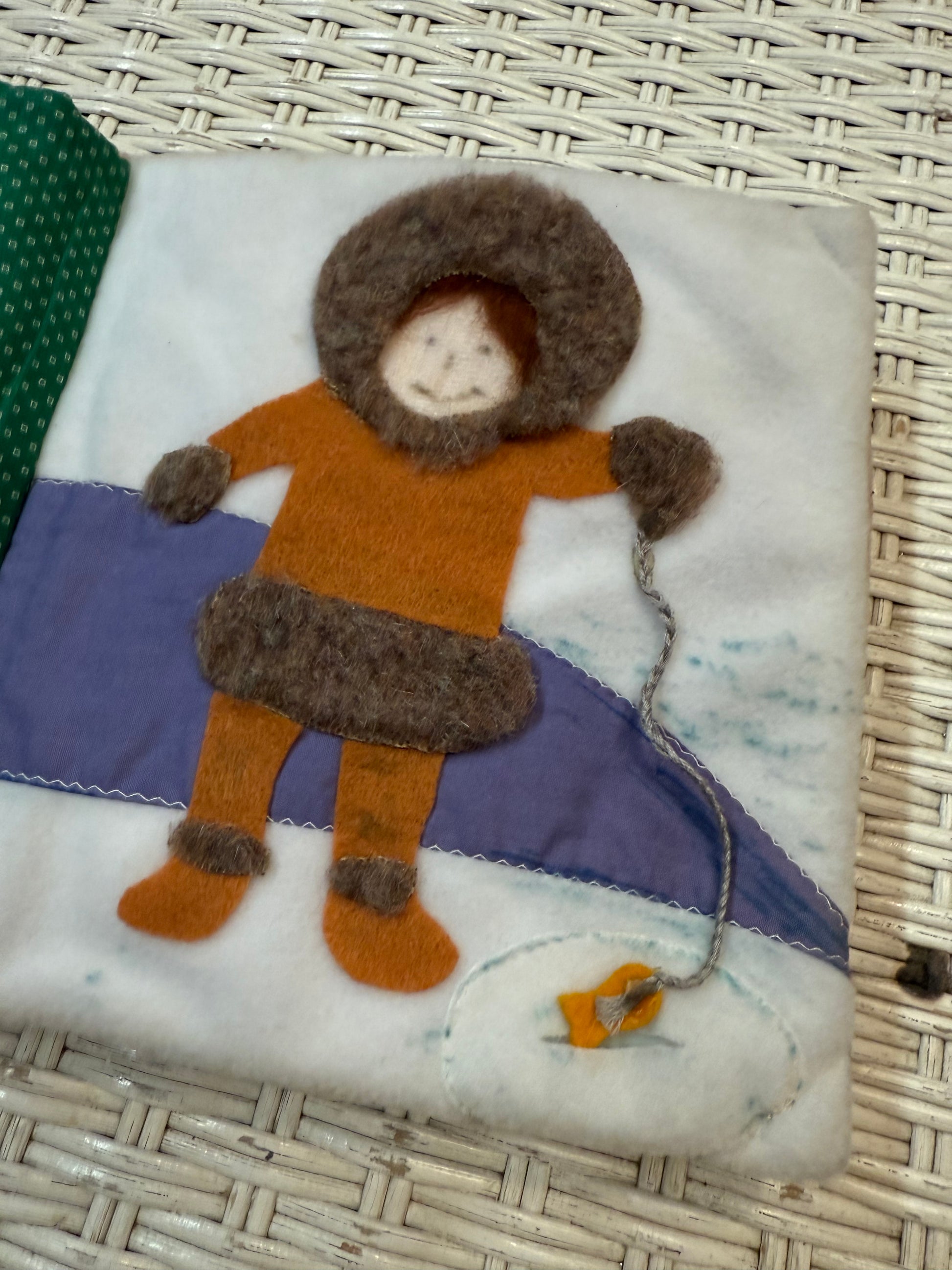 On the first page, a bold yellow letter A marks the beginning—of the alphabet, or of something else. The zipper practice page is delicately framed in lace. The last pages feature a stitched child ice fishing, alone in a white felt landscape. It’s peaceful, but quiet in a way that lingers.