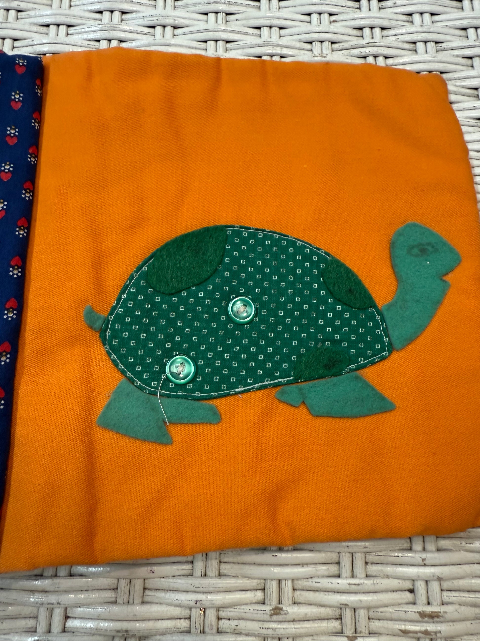 This handmade cloth quiet book, measuring approximately 9” x 9”, is a soft and strangely stirring piece of mid-century imagination. Its pages are padded, worn, and whisper-soft—each one containing a little world: a turtle whose shell buttons on and off… a lion with an untamable yarn mane… a little bear in a gingham dress who never seems to blink quite the same way twice.