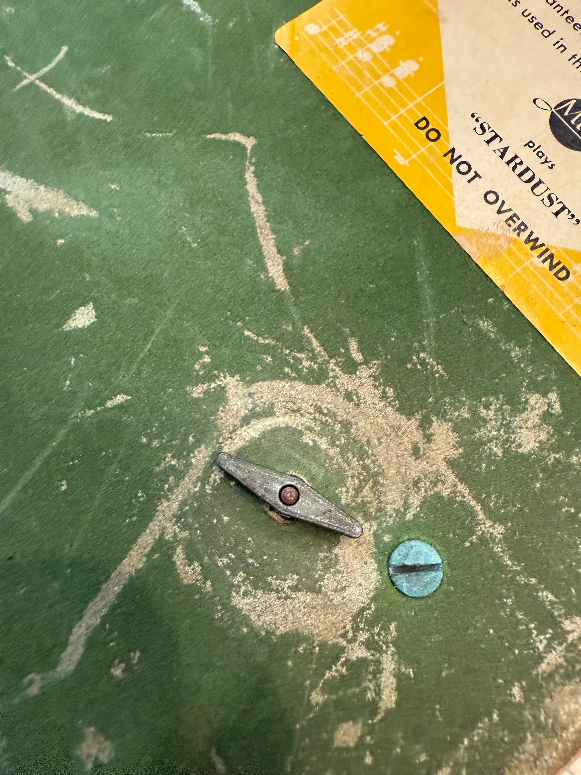 There’s something hauntingly sweet about the sound of Stardust floating from a jewelry box that’s lived through decades of whispered secrets, lost love letters, and stolen glances in the mirror. This vintage musical jewelry box, styled by Mele and fitted with a Thorens Swiss musical movement, holds not just treasures — but memories. Open the soft, gold-toned lid and you’re met with an emerald green velvet interior, aged to perfection with timeworn elegance. The lift-up tray still glides into place with its original brass arms, gently revealing its compartments — once home to string pearls and perhaps a class ring or two. Beneath the tray lies a deeper compartment, lined with the same faded velvet and a small block, likely used for a watch or ring box. 🎼 The melody it plays? “Stardust” — a timeless tune that could bring tears to the eyes of anyone who’s ever loved and lost, or loved and held on anyway. 🔎 Features: • Swiss-made Thorens movement – DO NOT overwind • Song: “Stardust” • Styled by Mele • Lift-up upper tray for rings and small items • Lower section for larger keepsakes • Original lining, untouched and beautifully worn • Exterior is a gold satin finish with signs of aging 📦 Condition: This piece is offered exactly as it was found and lovingly cleaned. There is visible wear, particularly inside the compartments and around the edges, but that only deepens the authenticity. The music box winds and plays. exterior and interior both have aged staining. Latch and hinges are intact. 📐 Size: Approx. 10” x 7 ✨ This is not just a jewelry box. It’s a time capsule. A melody box. A keeper of yesterdays and maybe even your next heirloom. |