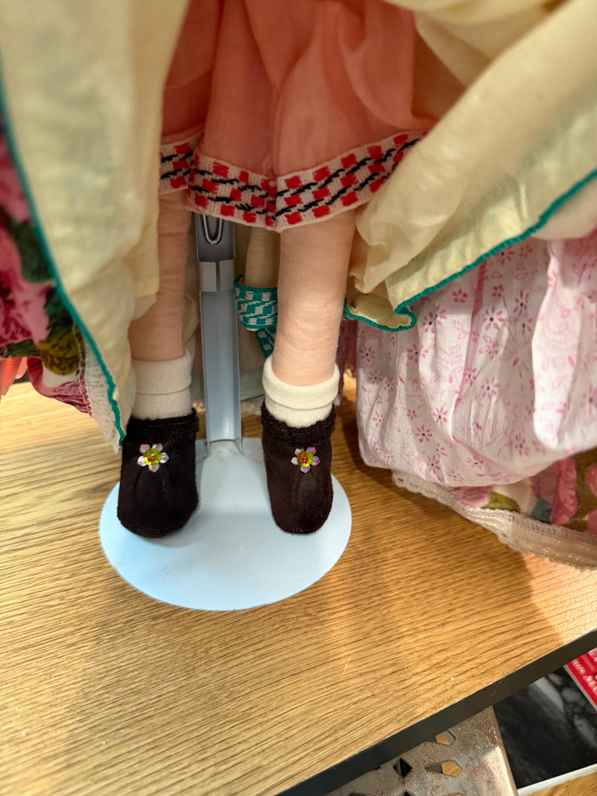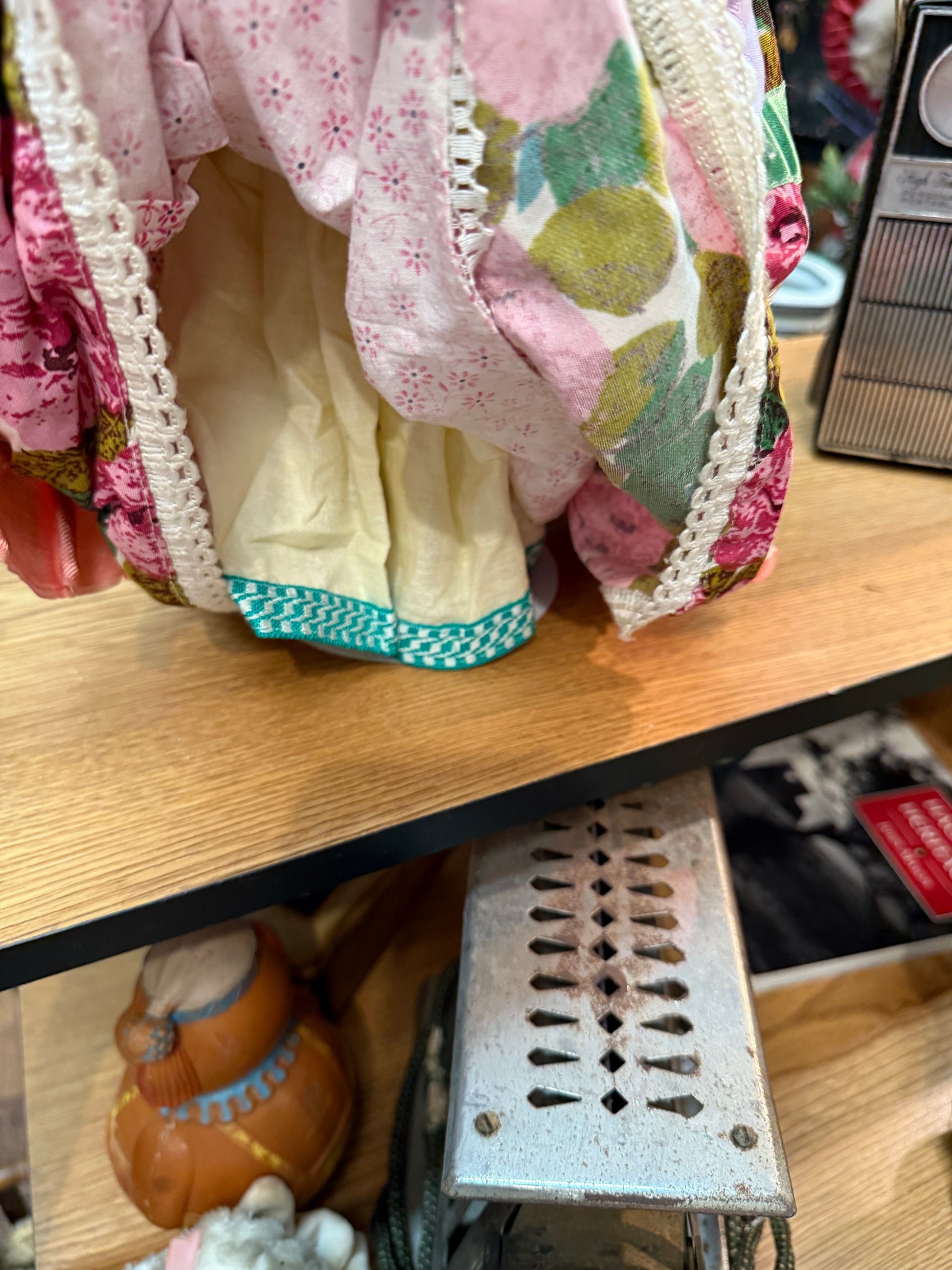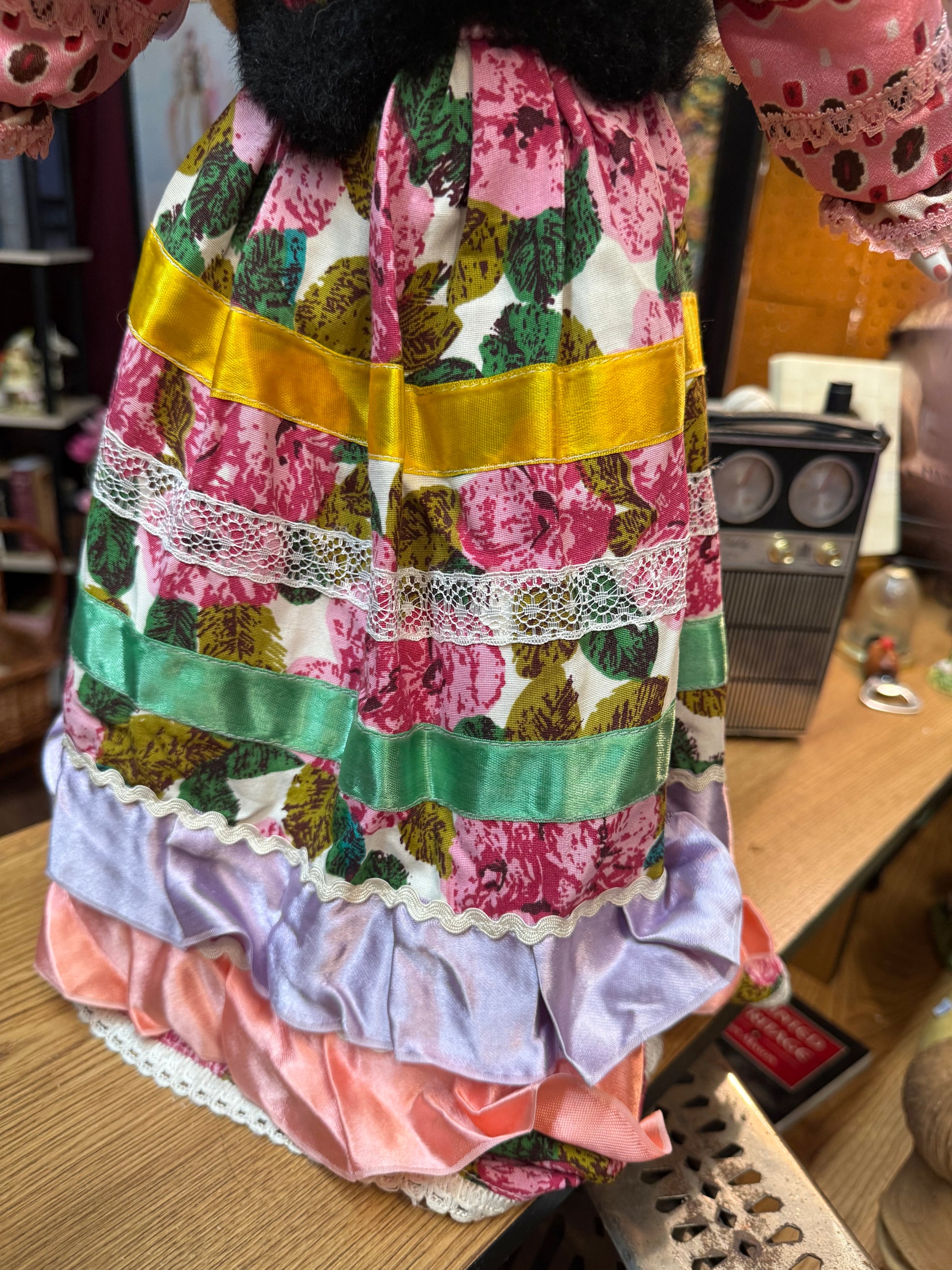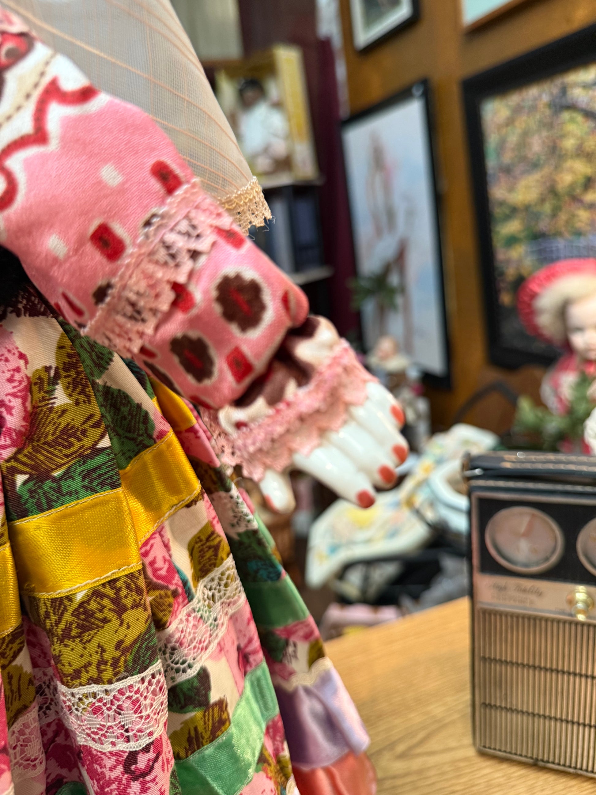 Discovered tucked behind an old bookcase in an estate filled with Eastern European relics, this porcelain folk doll seems to carry more than just tradition in her silken layers. Standing approximately 20” tall, she wears an ornate handmade costume typical of Slavic ceremonial garb — bright floral ribbons, embroidered petticoats, and a towering kokoshnik headdress sparkling with sequins and secrets. Her glassy eyes, painted with a distant melancholy, follow more than just your movement. According to the estate’s former owner, this doll was never to be moved from her perch in the home’s front window — “to keep the sorrow from coming in.” The doll’s hands are glazed porcelain, her legs soft cloth, and her outfit entirely intact, though imbued with a faint, aged perfume — the kind that clings to velvet-lined drawers and old letters. Her earrings still glimmer, and her painted red cheeks remain untouched by time… or perhaps preserved by something else entirely. We have not experienced anything unusual since acquiring her. But we also haven’t let her stay overnight inside the house. ⸻ 🕯️ Dimensions: Approx. 20” tall Materials: Porcelain head & hands, cloth body, fabric clothing Condition: Excellent vintage condition. Minor age wear. Display only. Provenance: Estate in the northeastern U.S. with Slavic heritage. ⸻ Note: Sold as a collectible only. No claims are made about supernatural activity — but do let us know if you feel a draft when she arrives. |